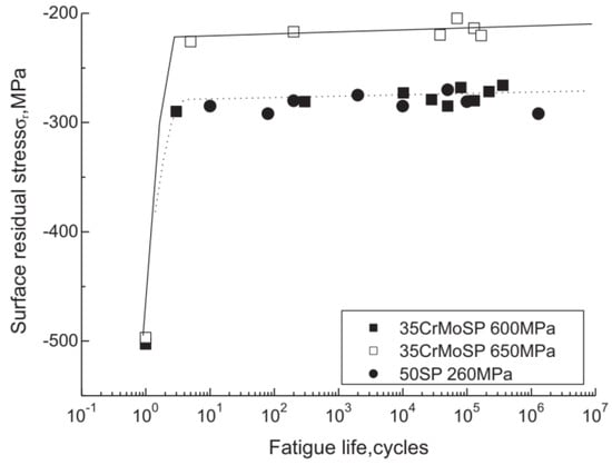 Comparison of compressive residual stress relaxation curves of microshot-peened 35CrMo and LZ50 steel specimens at relatively low fatigue stress levels compared to the material cyclic yield strengths. The specimens were subjected to rotary bending fatigue tests. Reprinted with permission from Ref. [13]. Copyright 2011 Elsevier.