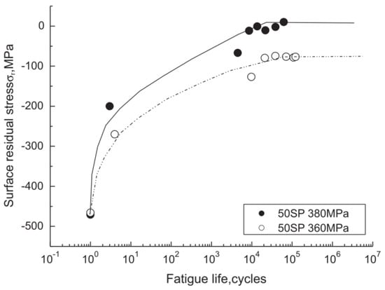 Finally, the relaxation of residual stress can gradually diminish the effectiveness of the induced residual stress. The study by Dong et al. [1] showed that more and faster stress relaxation can cause surface crack failures to occur at lower fatigue stress levels in SMRT-treated FSW 7075-T651 specimens. Research by He et al. [39] indicated that the residual stress on UIT-treated FSW 7075-T651 specimens relaxed the most in the low-cycle fatigue (LCF) regime and then relaxed at much slower rates in the HCF and VHCF regimes. Zhang et al. [13] found that the relaxation curves of microshot-peened 35CrMo and LZ50 steel specimens were affected by the residual stress distribution, fatigue load distribution, and material cyclic yield strengths. Zhang et al. [13] also showed that increasing the applied fatigue load could accelerate and increase residual stress relaxation in microshot-peened 35CrMo and LZ50 steel specimens. The cyclic yield strengths for 35CrMo and LZ50 steel specimens were 705 MPa and 313 MPa, respectively. Figure 15 shows the relaxation curves of the compressive residual stress in microshot-peened 35CrMo steel specimens at fatigue stress levels of 600 MPa and 650 MPa, and the relaxation curve of the compressive residual stress in microshot-peened LZ50 steel specimens at a fatigue stress level of 260 MPa. These fatigue stress levels were lower than the material cyclic yield strengths; thus, the compressive residual stresses quickly relaxed in the first few cycles and then became relatively stable. Figure 16 shows the relaxation curves of compressive residual stress in microshot-peened LZ50 steel specimens at fatigue stress levels of 380 MPa and 360 MPa. These fatigue stress levels were higher than the material yield strength; thus, the compressive residual stresses for the LZ50 specimens continued to relax until approximately Nf = 104 cycles before stabilizing. It is worth noting that the compressive residual stress was almost completely relaxed at the fatigue stress level of 380 MPa. Since the subsurface compressive residual stress tends to improve metal fatigue properties in the HCF regime and the internal tensile stress tends to worsen the fatigue properties of metals in the VHCF regime, it will be beneficial to optimize the residual stress relaxation curve such that the metal can benefit the most from residual stress throughout the fatigue life.