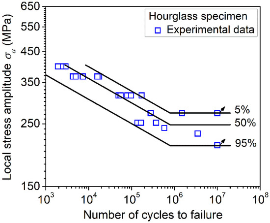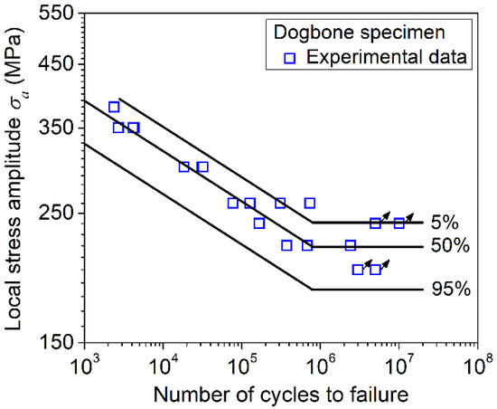 - Hanaki, S.; Yamashita, M.; Uchida, H.; Zako, M. On stochastic evaluation of S–N data based on fatigue strength distribution. Int. J. Fatigue 2010, 32, 605–609. [Google Scholar] [CrossRef]