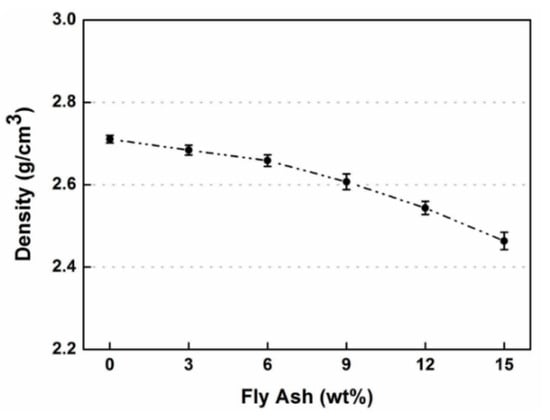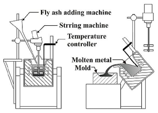 Fly ash is a type of reinforcement material with low density and low cost, and is available in large quantities as solid waste [,]. Several studies have shown that, compared with the base alloy, the composite material with fly ash particles, the so-called aluminum fly ash (ALFA) composites [], significantly improve the mechanical properties, wear resistance, corrosion resistance, high strength-to-weight ratio, low value of thermal expansion coefficients, good thermal performance, higher damping capacity, and wear resistance when compared to matrix alloys [,,,,,,]. Therefore, many industries have enhanced aluminum matrixes by adding reinforcement materials to meet their production requirements []. For example, aluminum-based composites are often used to manufacture pistons, cylinder liners, drum brakes, connecting rods, parts of vehicle braking systems, and Cardan shafts. Regarding the application of aluminum in automobiles, studies have shown that the composite technology allows the production of lightweight, low-cost, and high-performance brake discs. Moreover, owing to their good mechanical properties, low density, and high strength-to-density ratio, they are widely used in aviation, marine, and aerospace [,,,,].