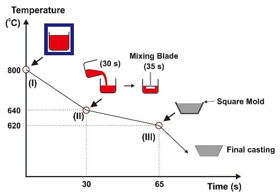 To overcome this phenomenon, the preparation steps of the experimental test specimen are shown in Figure 2: (1) first, reduce the temperature of the high-temperature furnace from 800 °C to 640 °C and continue to stir the slurry in the furnace until it reaches a uniform temperature for a period to avoid the floating of fly ash due to the long formation period of slurry; (2) remove the graphite pot from the high-temperature furnace, scrape the oxide layer on the top of the slurry to avoid it remaining in the casting to form defects, pour the slurry, and scrape off the oxide layer into the steel cup preheated to 180 °C; this takes approximately 30 s; (3) to evenly disperse the fly ash in the slurry, mechanically stir the mixture for 35 s at 150 rpm; (4) after completely stirring, immediately pour the slurry into the stainless-steel square mold (400 × 320 × 130 mm) preheated at 150 °C to form the test piece. After it is cooled, the production of the experimental test piece is completed. The ALFA composites prepared by this procedure ensure a uniform distribution of fly ash in the aluminum alloy melt [,].