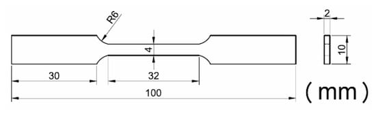 A CNC machining center was used to machine the ALFA composite block into the tensile test specimen, as shown in Figure 3. The tensile test piece was then ground using # 400 abrasive paper. According to the ASTM–E8 specification, a universal tensile testing machine (HT-9102 tensile testing machine from Shanghai Hongxing Ultrasonic Electronic Instrument Co. Ltd., 2678, Qixin Road, Minhang Qu 201100, China) with a capacity of 50 kN was used to perform the tensile test at a strain rate of 2.5 × 10−4 s−1.