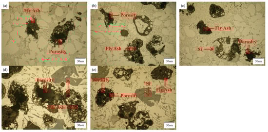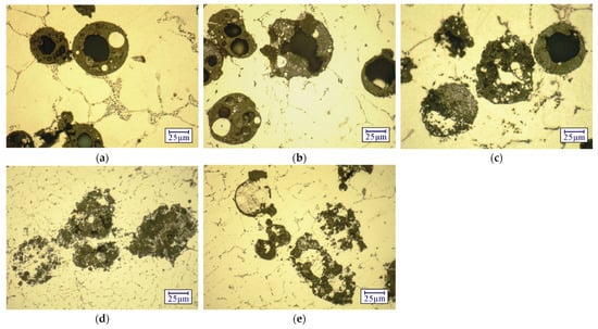 Figure 6 shows optical micrographs of the ALFA composites prepared with different fly ash addition ratios at 500× magnification. As observed, no obvious gap existed between the fly ash particles (solid phase) and aluminum matrix (liquid phase). The good binding between the solid and liquid phases proves that pretreatment of the fly ash and the addition of pure magnesium to the liquid metal can effectively improve the wettability between the fly ash particles and aluminum matrix, and then obtain good dispersibility []. Moreover, after the fly ash was chemically reacted, the particles decomposed into fragments; however, not all the fly ashes reacted, and some of the fly ashes appeared black inside, which was the internal pore of the original fly ash.