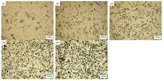 Microstructure of aluminum-based fly ash composites (50×): (a) 3 wt% of fly ash, (b) 6 wt% of fly ash, (c) 9 wt% of fly ash, (d) 12 wt% of fly ash, and (e) 15 wt% of fly ash.