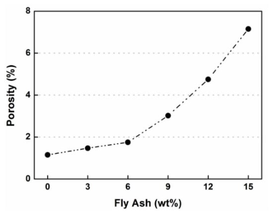 Figure 7 and Figure 8 show the examination results of the density and porosity of the ALFA composite. As shown in Figure 7, the density of the composite decreased as the amount of fly ash increased, indicating that an increased amount of fly ash made the composite lighter. This is because most fly ashes are hollow and porous and their bulk density is lower than that of aluminum matrix. In contrast, the density of the composite decreased and its porosity increased with the addition ratio of fly ash content, as shown in Figure 8. The ALFA composite was used to perform the chemical reaction at a high temperature of 800 °C for 30 h, although the fly ash was decomposed and broken by the reaction, allowing the aluminum alloy to fill the pores inside the fly ash. However, many pores still existed inside the fly ash that had not been filled by the matrix alloy, which is a reason for the increase in the porosity of aluminum-based fly ash composites. In addition, with a higher addition ratio of fly ash in the ALFA composite preparation process, the fluidity of the slurry reduced and the air involved in the slurry with the stirring operation was more difficult to discharge, resulting in the occurrence of porosity defects in the composite. This was more evident when the addition ratio of fly ash was higher than 9 wt%, which caused its porosity to increase rapidly. When the porosity increased, more defects in the composite negatively influenced its mechanical properties.