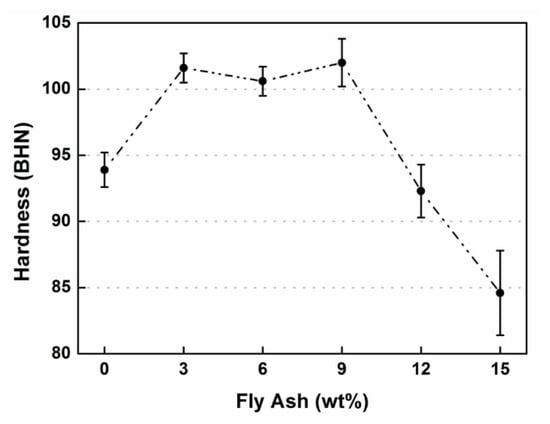 The hardness test results of the composite made by each fly ash addition ratio are shown in Figure 9. The hardness was higher than those of the original aluminum matrix when the addition ratios of fly ash were 3, 6, and 9 wt%, indicating that the addition of fly ash contributed to an increase in the surface hardness of the composite. However, the hardness decreased when the fly ash addition ratio exceeded 9 wt%. According to Myirionis and Kumar [,], it can be reasonably inferred that the formation of the Al2O3 reinforcing phase owing to the reaction between fly ash and aluminum matrix at low fly ash addition ratios, Al2O3, and Si, react with Mg to form reinforcing phases such as MgAl2O4 and Mg2Si, which increase the surface hardness of the composite. Owing to the high quantity of fly ash, the viscosity of the slurry increased when the fly ash addition ratio exceeded 9 wt%, and the entrainment of air in the slurry made it difficult to dislodge during the stirring process, resulting in obvious pore defects. Hence, the surface hardness of the composite decreased as the porosity defects increased, and a considerable relationship existed between this trend and porosity. Because the porosity of the composite was less than 2 wt%, it had little effect on its hardness; however, when it was over 2 wt%, the porosity defects had a dramatic effect on the surface of the composite. At 12 wt% and 15 wt%, the surface hardness of the composite was lower than that of the matrix alloy. According to the results, the hardness of the ALFA composite with 9 wt% of fly ash was highest. It comprises BHN 102, which is 9% higher than that of the original aluminum alloy.