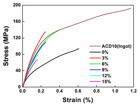 The tensile test results for the composites produced with different fly ash addition ratios are shown in Figure 10. In this study, the tensile strength and elongation of the original ADC10 ingots were higher than those of the composites prepared by a chemical reaction at 800 °C for 30 h, especially for the casting prepared with no fly ash addition (0 wt%). Compared with the properties of the original ADC10 ingot, the tensile strength and elongation of the ALFA composite showed a significant decrease, which was only half that of ADC10. This result may have been influenced by the small-capacity crucible (2 kg) used in this experiment. During the preparation of the ALFA composite slurry, the degassing operation was not performed and the slag was removed by scraping off the scum on the surface of the slurry that had been reacted for 30 h in the crucible. Consequently, porosities and inclusions may have existed in the ALFA composite, resulting in the failure of the mechanical properties to reach the expected value. Furthermore, compared with castings prepared with no fly ash addition, the tensile strength of composites containing fly ash (3, 6, 9, 12, and 15 wt%) was improved because of an increase in the Al2O3 reinforcing phase generated by the chemical reaction, although Al2O3 may cause the material to become brittle and less ductile. The best fly ash addition ratio was 6 wt% for the ALFA composites. The tensile strength and elongation were 139 MPa and 0.4%, respectively, which were approximately 49% higher and approximately 35% lower than those prepared without fly ash at the same temperature for 30 h, respectively. When the fly ash addition ratio was higher than 9 wt%, the tensile strength of the composite decreased significantly owing to the increased porosity of the composite.