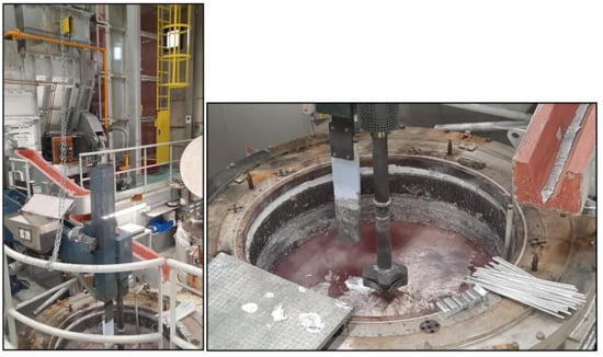 Gas tower furnace used for melting process (image on the left) and ladle used for degassing, adjustment of composition and addition of AlSr10 and Al5Ti1B master alloys (image on the right).