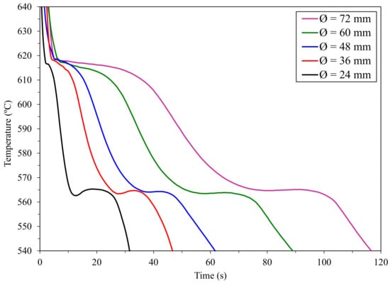 Different cooling curves obtained from the cylindrical test castings produced in one of the sets (data from [