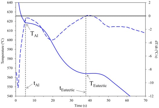 Characteristic solidification parameters in the cooling curve obtained from the test casting with 48 mm in diameter. The solid line corresponds to the cooling curve and the interrupted line is the first derivative curve.