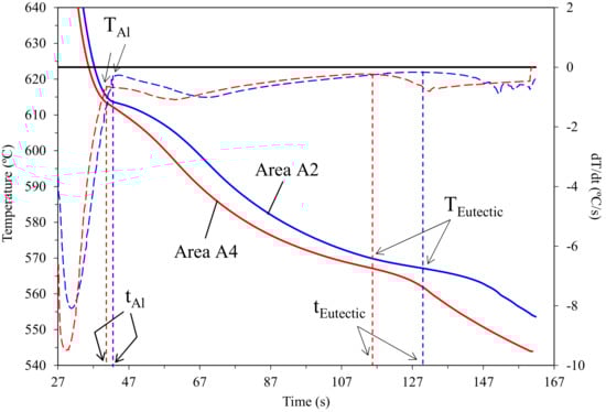 Characteristic solidification parameters in the simulated cooling curves (solid lines) obtained from areas A2 and A4 in casting SK-1. First derivative curves are plotted as interrupted lines.