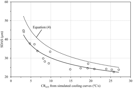 Evolution of experimental (dots and solid lines) and calculated SDAS (interrupted and dotted lines) in the SK-1 to SK-6 castings with (