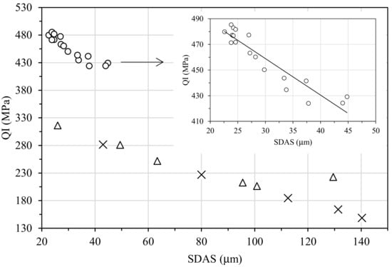 Evolution of experimental SDAS with QI in castings SK-1 to SK-6 (open circles), and in series A (crosses) and series C (open triangles) from Khomamizadeh et al. [