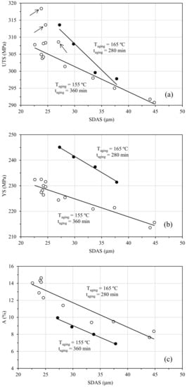 Evolution of UTS (a), YS (b) and A (c) with the experimental SDAS in castings SK-1 (solid circles) and in castings SK-2 to SK-6 (open circles).