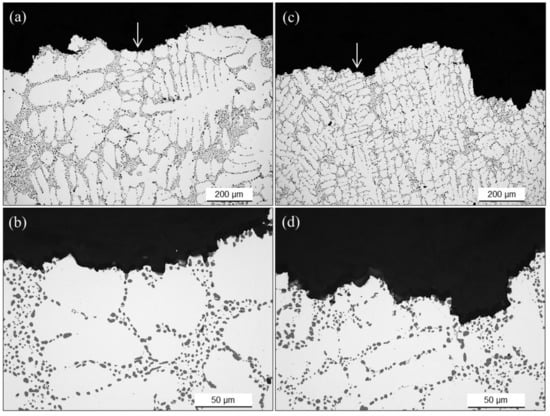 Cross sections of the tensile specimens obtained from casting SK-1: (a,b) area A1 with SDAS of 37.8 μm, (c,d) area A4 with SDAS of 27.2 μm. Images (b,d) correspond to high magnification views of the zones indicated with white arrows in images (a,c), respectively.