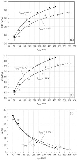 Evolution of UTS (a), YS (b) and A (c) with aging time in castings TA at 165 °C (solid circles) and at 155 °C (open circles). Best least square fits are plotted as a solid line and as an interrupted line for Taging = 165 °C and 155 °C, respectively.