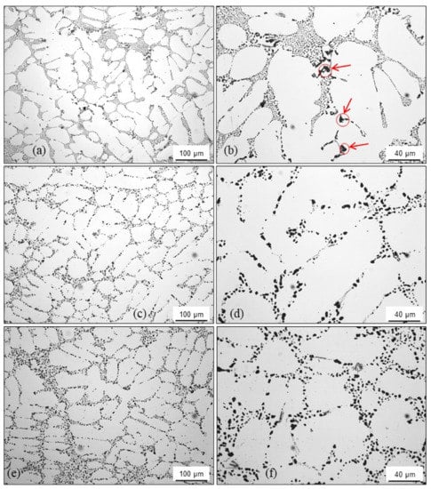 Optical micrographs of the alloy A356.2 used to produce the TA castings: (a,b) as cast microstructure, (c,d) after solubilization and quenching steps. Images (e,f) show the microstructure observed in a TA casting aged at 155 °C for 200 min.