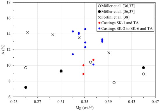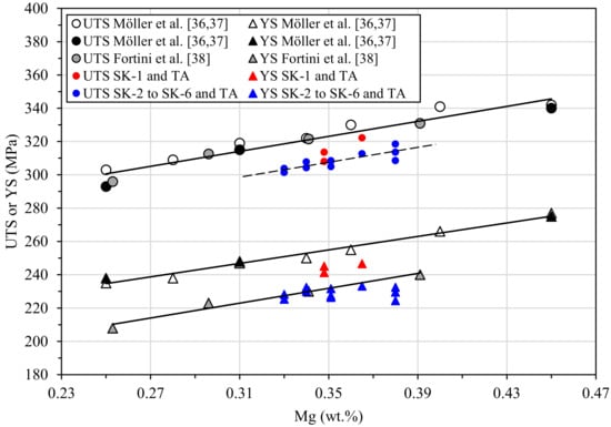 38]. The different aging treatments were 180 °C and 60 min for alloys from Möller et al. while they were 155 °C and 270 min for alloys from Fortini et al. Red and blue symbols correspond to UTS (circles) and YS (triangles) values obtained from SK-1 to SK-6 and TA castings used in this work which were aged at 165 °C for 280 min and at 155 °C for 360 min, respectively (see the text).