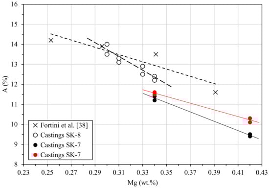 Evolution of A with Mg content for the series of A356 alloys reported by Fortini et al. [