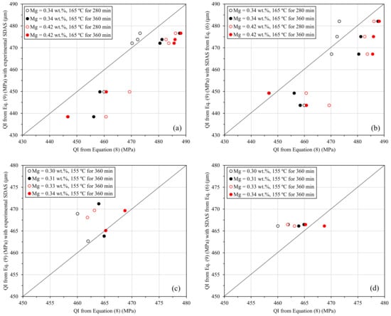 Comparison of QI values calculated with Equation (9) and those determined by using Equation (8). For the former equation experimentally measured SDAS (a,c) and the values of this parameter determined with Equation (6) (b,d) were used. The two graphs in the top row correspond to casting SK-7 while the two ones in the bottom row were obtained with data from castings SK-8. In case of SK-7 castings black and red circles correspond to the castings manufactured with 0.34 wt.% Mg and 0.42 wt.% Mg, respectively. In these two cases, open and solid symbols represent those castings aged at 165 °C for 280 min and at 165 °C for 360 min, respectively. For SK-8 castings increasing Mg content is given by black open (0.30 wt.%), black solid (0.31 wt.%), red open (0.33 wt.%) and red solid circles (0.34 wt.%). Solid lines are the bisectors.