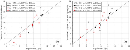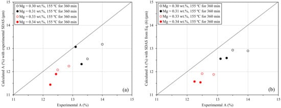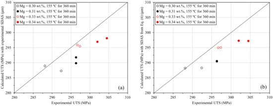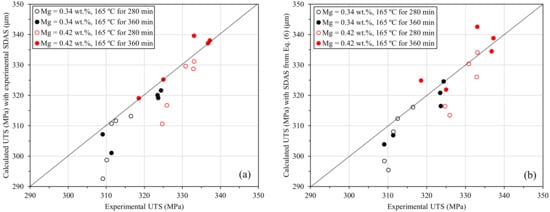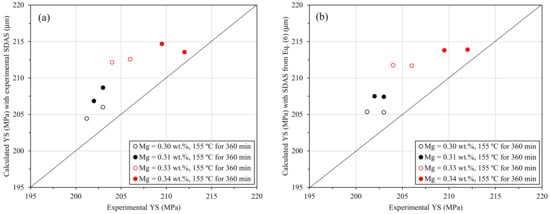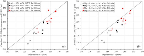 b). Black symbols correspond to SK-7 castings manufactured with 0.34 wt.% Mg while red symbols correspond to castings produced with 0.42 wt.% Mg. In both cases, open and solid circles represent those castings aged at 165 °C for 280 min and for 360 min, respectively. Solid lines are the bisectors.