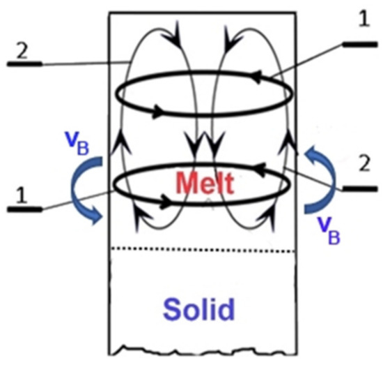 It seems reasonable to flow the metallic melt using a rotating magnetic field (RMF) parallel to the solidification front [5,6,7,8]. A sketch of the flow can be seen in Figure 1. When using an RMF for flowing, two types of macrosegregation can be observed if the field is large enough to cause grain refinement via separation of the many solid particles through the melt flow developed by the RMF [9]. Under the influence of the primary flow (parallel to the solidification front, “1”), macrosegregation develops in the middle or at the edge of the workpiece. Furthermore, under the influence of the secondary flow (that has a much lower intensity than the intensity of the primary flow, “2”), when delivering the alloying elements from the mushy zone perpendicular to the solidification front, macrosegregation develops in the direction of the longitudinal axis of the workpiece. Consequently, this type of magnetic stirring is impractical, though it can lead to grain refinement to a certain extent.