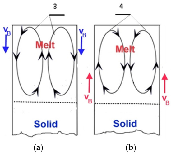 The metallic melt can flow using a traveling magnetic field (TMF) perpendicular to the solidification front if the velocity of this traveling magnetic field is identical or opposite to the direction in which the solidification front is moving (Figure 2) [10,11,12,13,14].