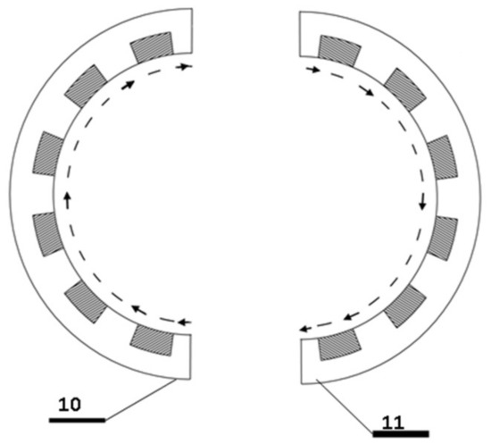 The solidification equipment uses one TMF twin inductor for flowing the metallic melt. The construction of this TMF twin inductor is significantly different from that of the traditional magnetic stirrers, with a closed magnetic circuit [17]. This TMF twin inductor with a closed magnetic circuit can be derived from any RMF inductor with an even pole-pair number. The derivation steps are demonstrated using an RMF inductor with two pole-pair numbers (4 poles). The steps of the derivation can be seen in Figure 4, Figure 5, Figure 6, Figure 7, Figure 8, Figure 9.