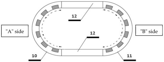 Therefore, a traveling magnetic field moving vertically in opposite directions develops on the “A” and the “B” vertical side (see in Figure 3, Figure 10, Figure 11).
