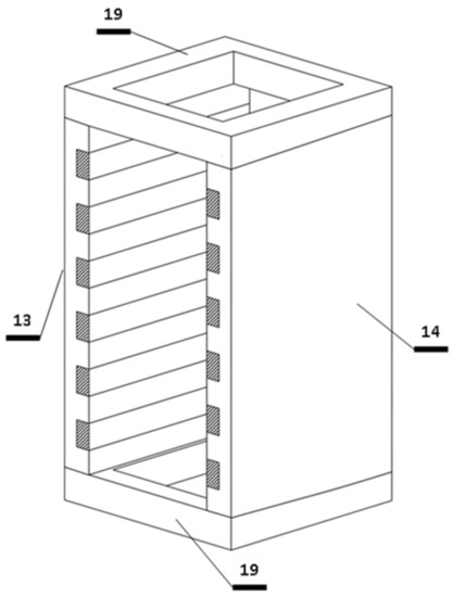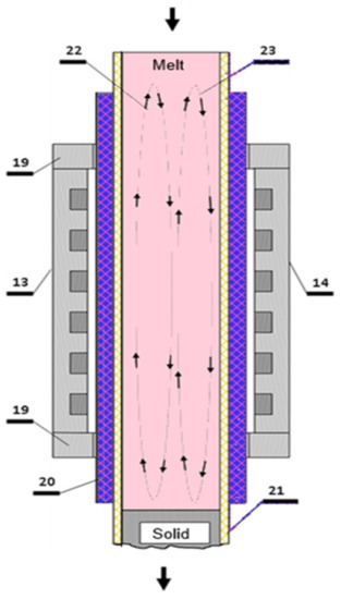 The metallic melt to be solidified can be added through the upper opening of the solidification channel (“21”), as is demonstrated in Figure 11 It starts to flow intensively under the influence of the traveling magnetic field generated by the TMF twin inductor in the solidification channel. Then, it flows through the solidification channel and will be cooled (solidified) by the heating–cooling mantle.