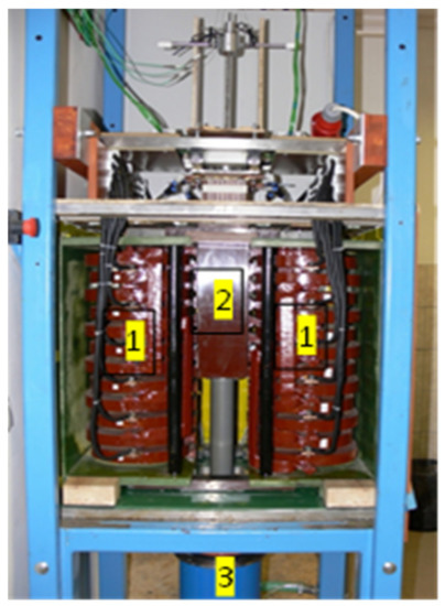 The traveling magnetic field is induced with the two-pole twin inductor built parallel to the furnace (Figure 13). The maximum magnetic induction of the twin inductor and the maximum frequency were 150 mT and 75 Hz, respectively. The intensity of the magnetic field traveling in a direction parallel to the axis of the sample was constant throughout the experiment.