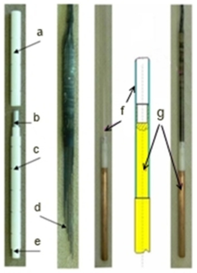 Sample and sample holder where (a) and (c) are the upper and lower alumina capsule, (b) is the sample, (d) is the thermocouples, (e) is the connection part of the lower alumina capsule to the copper cooling core (g), and (f) is the quartz tube.