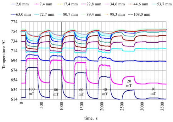 Figure 15 shows the changes in temperature distribution after switching the TMF “xy” type twin inductor on and off. The Al–7%Si sample diameter and length were 8 and 110 mm, respectively. The structure of the sample holder is in Figure 14. The liquidus temperature of the alloy was 614 °C; this was the temperature at 2 mm, and it was 750 °C at 108 mm at the start of the experiment (0 mT), such that the whole sample was practically melted. The inductor was switched on and off step by step every 300 s, changing the magnetic induction from 100 to 10 mT. As a result of the melt flow induced by the TMF, the temperature in the melt increased between 0 and ~26 mm and decreased between ~26 and 110 mm. The temperature increase and decrease values are higher, and the temperature difference in the sample is smaller with higher magnetic induction (Figure 16). This information is usable in planning experiments and simulating the melt flow.