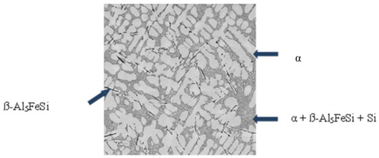 The microstructure of the alloy consisted of α aluminum solid solution dendrites and binary (α + β-Al5FeSi) and ternary (α + α-Al5FeSi + Si) eutectics. The binary eutectic degenerated and consisted of only the ß-Al5FeSi compound.
