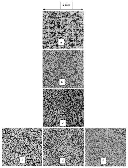 Dendritic structure of unidirectional solidification of the Al–7%Si–1%Fe alloy. Etching with 2 V% HF water solution. Temperature gradient (G): 5 K/mm, solid/liquid front velocity (v): 0.05 mm/s. (a) B = 0 mT, (b) B = 40 mT, “x” type, (c) B = 40 mT, “y type”, (d) B= 40 mT, “xy” type, (e) B = 20 mT, “xy” type, and (f) B = 80 mT, “xy” type.