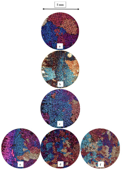 Unidirectional solidification experiments were performed with three different (“x”, “y”, and “xy”) types of traveling magnetic field. The material was Al–7%Si–1%Fe alloy. The dimensions of the cylindrical samples were Ø 8 mm x 110 mm, the temperature gradient (G) was 5 K/mm, and the solid/liquid interface velocity (v) was 0.05 mm/s. The synchronous velocity of the magnetic field was 29 m/s. With the first series of experiments, the effect of the different types of magnetic fields was investigated. The magnetic induction (B) was 40 mT. The magnetic field moved upwards in the case of the “x” and “y” type experiments (sample “b”, “c”), while in the case of the “xy” type experiments (samples “d”, “e”, and “f”) it moved upwards on one side and downwards on the other. With the second series of experiments, the effect of the value of the magnetic induction was investigated. In the case of the “xy” type experiments, the magnetic field was 20, 40, and 80 mT, and the other parameters of the experiments were the same as for the first series. After grinding and polishing with diamond paste, the samples were etched using a 2 V% HF water solution (Figure 17 and Figure 18) and then Barker solution (Figure 19). The dendritic and the grain structure were studied on the HF-etched and Barker-etched images, respectively.