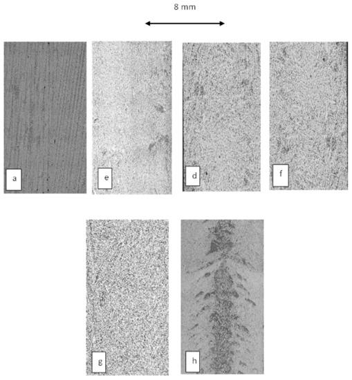 Macrosegregation in unidirectional solidification of the Al–7%Si–1%Fe alloy. Etching with 2 V% HF water solution. Temperature gradient (G): 5 K/mm, solid/liquid front velocity (v): 0.05 mm/s, “xy” type. (a) B = 0 mT, (e) B = 20 mT, (d) B= 40 mT, (f) B = 80 mT, temperature gradient (G): 5 K/mm, solid/liquid front velocity (v): 0.2 mm/s, (g) B = 80 mT, “xy” type, and (h) stirring by RMF (B = 80 mT).