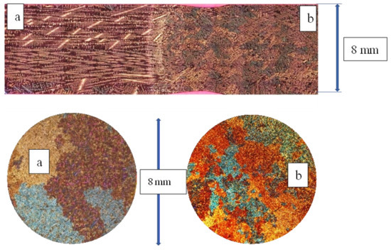 The Al–10%Si–0.2%Fe alloy was solidified by stirring using the new TMF stirrer (Figure 21). The temperature gradient, the solid/liquid interface velocity, and the cooling rate were 5 K/mm, 0.2 mm/s, and 1.0 K/s, respectively. The part “a” of the sample was not stirred, and the “b” part was stirred at 110 mT with the frequency set to 50 Hz. The sample diameter and the length were 8 and 100 mm, respectively. After solidification, two cross-sections were cut from the sample near where the TMF was switched on, and then, the part between the two cross-sections was cut parallel to the sample axis. The cross and the longitudinal sections were ground and polished using diamond paste and etched with Barker solution.