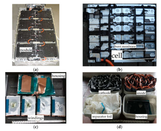 - Diekmann, J.; Sander, S.; Sellin, G.; Petermann, M.; Kwade, A. Crushing of Battery Modules and Cells. In Recycling of Lithium-Ion Batteries-The LithoRec Way; Kwade, A., Diekmann, J., Eds.; Springer: New York, NY, USA, 2018; pp. 127–138. [Google Scholar]