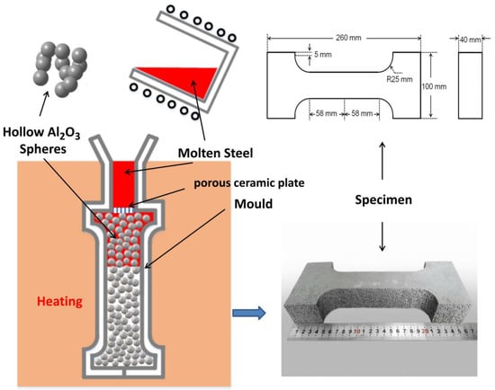 The SSFs investigated in this study were produced by a low-pressure infiltration casting method. The specific preparation methodology has been described elsewhere [21]. A schematic of the infiltration is illustrated in Figure 1. To summarize, the Al2O3 hollow spheres were packed randomly and densely in a graphite crucible mold, and the mold was preheated in a vacuum medium-frequency induction furnace. Meanwhile, the matrix material, ASTM CF-8 cast austenitic stainless steel, was melted at 1550 °C and poured into the preheated mold under a vacuum operated at less than 10 Pa. After solidification, the syntactic foams were machined into the desired shape for characterization.