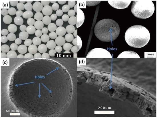 A macro photograph and microstructure images of the Al2O3 hollow spheres and the SSFs are shown in Figure 2 and Figure 3, respectively. It can be seen from Figure 2a–c that the particles used in this study were almost perfectly spherical. Surface defects, however, were also detected on the sphere wall, with smaller micropores embedded inside the sphere wall and larger microspores extending through the entire sphere wall, as indicated by the arrows in Figure 2b–d. The commercially available Al2O3 hollow spheres, which were produced by a blowing method, have uneven sphere wall thicknesses in the range of tens to hundreds of micrometers. During the pressure infiltration process, a thin sphere wall with micropores may crack under pressure, resulting in infiltrated particles.