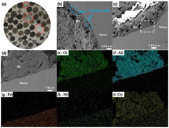 Figure 3b–d shows that the hollow spheres and the metal matrix appeared to bond well, and a clear interface can be observed between the hollow spheres and metal matrix in the SSFs. As illustrated in Figure 3b, some casting voids were found around the interface between the matrix and sphere wall, which were possibly the result of incomplete infiltration and shrinkage cavities caused by the difference in the thermal conductivity between the hollow spheres and metal matrix, and the low wettability between the metal melt and alumina HS. The presence of the voids indicated that the combination between the hollow spheres and the matrix was by simple physical adhesion.