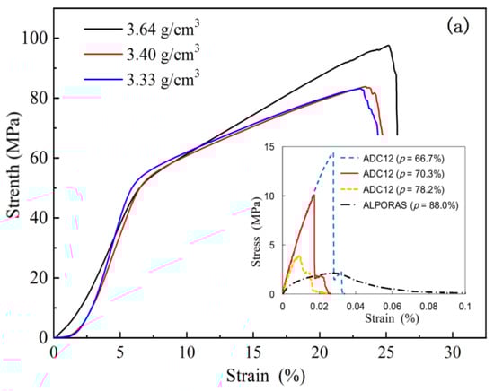 (a) Tensile stress–strain curve of SSFs and typical aluminum foam (the inner image [41]). (b) Comparison of the UTS of different types of metal foams [11,32,36,38,42,43,44,45,46,47].