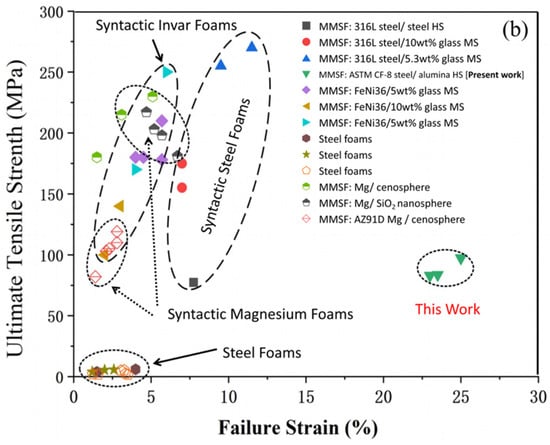 The tensile data collected from the literature of different types of metal foams are given in Figure 4b. It is evident from this figure that the tensile strength of conventional steel foam maintains at a low level (less than 10 MPa) [43,44,45]; in contrast, the tensile strength of the syntactic metal foams is much higher. In a variety of metal matrices, from steel [32,38], invar [36,42], or light metal magnesium [11], the introducing of reinforcement particles (hollow spheres or glass microspheres) gave the tensile strength of the metal foam a significant enhancement. It is worth noting that the sizes of reinforcement particles also have a great influence on the UTS of the syntactic metal foam. Of particular interest is that the tensile failure strain of the syntactic steel foam prepared in the present work is significantly greater than that of A. Rabiei et al. [38]. A plausible explanation is that we chose a ductile steel (ASTM CF-8 cast austenitic stainless steel) to be the matrix, which greatly expands the application of high melting point syntactic foam in tensile loads.