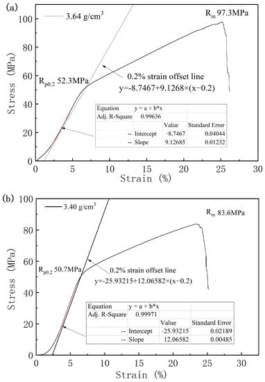 The TYS was obtained using the 0.2% strain offset method. Figure 6 represents the tensile stress–strain curves of MMSFs with different densities and the corresponding 0.2% strain offset line. Table 3 summarizes the tensile properties of the syntactic foams and the corresponding bulk material. Studies have shown that the relative density and the internal cell structure will significantly affect the mechanical properties of syntactic foams under tensile loads. In general, the greater the relative density, the greater the failure stress of the syntactic foams, and strong syntactic foams commonly benefit from a uniform distribution of micropores in the metal matrix.