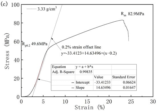 Tensile stress–strain curves of SSFs with different densities, (a) 3.64 g/cm3, (b) 3.40 g/cm3, (c) 3.33 g/cm3.