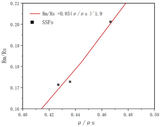 where ρ and ρs are the density of the syntactic foams and the corresponding bulk metal, respectively. Rm and Rs represent the UTS of the syntactic foam and bulk metal, respectively. C1 and m are constants related to the geometric structure of the MMSFs, which must be determined in this study. With the data listed in Table 3, three groups of Rm/Rs and ρ/ρs values could be calculated. Subsequently, the C1 and m were determined as 0.85 and 1.9, respectively. Finally, the constitutive relationship of the SSFs under uniaxial tensile loads can, therefore, be given as:
