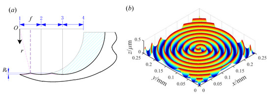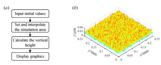The modeling process of the 3D fractal surface can be divided into the following four steps. Firstly, the initial values of the simulation needs to be inputted: the initial values are M = 10, γ = 1.5, L = 1 × 10−3 m, Ls = 5 × 10−9 m, D = 2.5, G = 10−8, and φm,n = π/6, respectively [31]. Secondly, the simulation area is set and interpolated. 256 × 256 interpolation is performed on the simulation area in this paper, and the data after interpolation are taken as the x and y coordinate values. The next step is to use m and n as loop variables to calculate the vertical height z of the fractal surface. Through the above process, the topography of the 3D fractal surface can be obtained. Finally, the vertical height under the corresponding coordinates is displayed graphically. Figure 2b shows the 3D fractal surface under D = 2.5 and G = 10−8. The plan view of the measured topography for the grinding surface and the 3D topography of the measured grinding surface can be found in Figure S1.