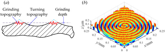 It can be seen from Figure 3a that the combined machining topography is a secondary grinding of the surface asperities on the basis of the original turning topography. Based on the cutting theory, during the secondary grinding process of the turning surface, the top area of the residual height of the turning surface will be cut off by the abrasive grains of the grinding wheel. That is, the secondary grinding process will leave the grinding topography on the top area of the original turning topography.