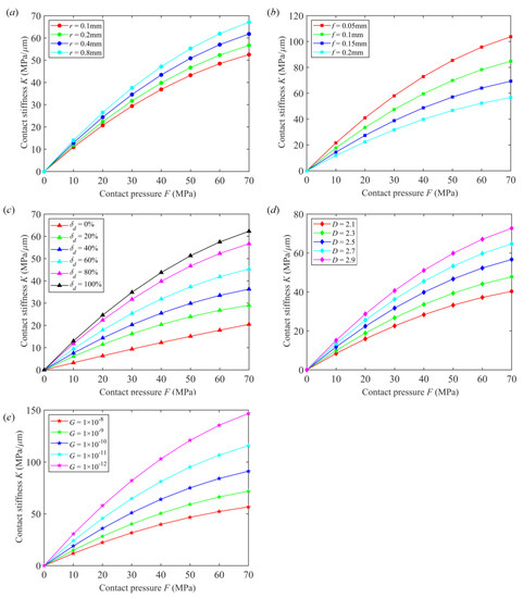 Based on the comparison results in Figure 7d, under the condition of the same fractal dimension, the normal contact stiffness increases with the increase in the contact pressure. When the contact pressure F = 70 MPa, the contact stiffness reaches the maximum values, which are 40.33 MPa/μm, 47.82 MPa/μm, 56.69 MPa/μm, 64.76 MPa/μm, and72.73 MPa/μm, respectively. The above results can be analyzed in combination with the distribution and deformation laws of asperities on the rough surface. Under the condition of the same fractal dimension and with the continuous increase in the contact pressure, the number of asperities involved in the contact on the rough surface increases, resulting in a gradual increase in the contact stiffness.